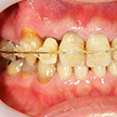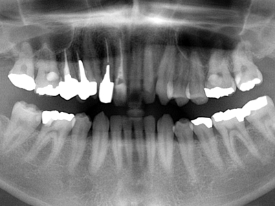 全顎パノラマ写真においては右上1番が失活歯、2番は叢生のままで不適合な前装冠(差し歯)、八重歯の3番は健全歯、4,5番も2番同様不適合冠処置となっています。比較的プラークコントロール(以下PCR)の良好な(歯ブラシの仕方が上手な)この患者様も同部が上手に磨けず不潔となり崩壊過程にあることが考えられます。