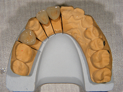 右上1,2,4番(3番以外)の歯冠を作成するための精密模型です。以前より入っていた不適合の冠2,4番と根管充填のままの1番です。患者様は歯列改善に対して喜んで下さり、セラミック冠(MB冠、自費でまたやっていただけました。1歯11万5500円、14Kコア別途)で作成することになりました。患者様の医療不信は解けましたが、信頼に応えるための責任の重さを強く感じます。