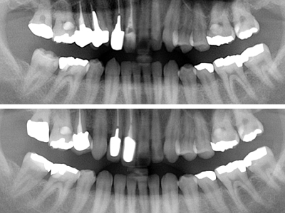 初診時X線パノラマ写真と比較してレントゲン上でもシンプルだと考えます。4番の近心側のPCR等は注意して、今後の定期健診に期待いたします。