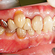 右上の3番(犬歯)がいわゆる八重歯で、その周囲被覆冠(特に一つ後ろの4番はセラミック冠であったが、2次カリエス顕著)の清掃が困難になっていました。もともと口腔清掃状況は良好でしたが、その叢生部の清掃が困難な環境だと判断し、矯正による歯列の改善を提案いたしました。その後は、同周囲部の不良歯冠の交換や失活歯の処置で、都合3歯をセラミック冠にいたしました。審美的に口腔環境を改善できた症例です。これだけプラークコントロールの良い患者様でも、周囲環境が悪く2次カリエスを作るのなら(最初からカリエスの取り残しで、自費のセラミックを入れたとは思えませんので)、安価な健康保険の被覆歯にして、その分のお金で歯列改善をした方が良かったのではと考えさせられます。「セラミックの歯がいくら」ではなく、「環境の改善にいくら掛ける」が、重要なのです。